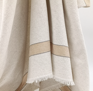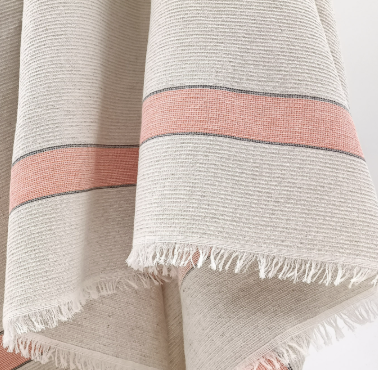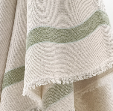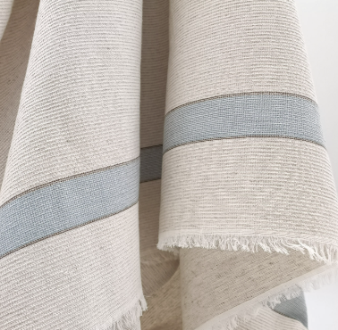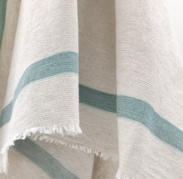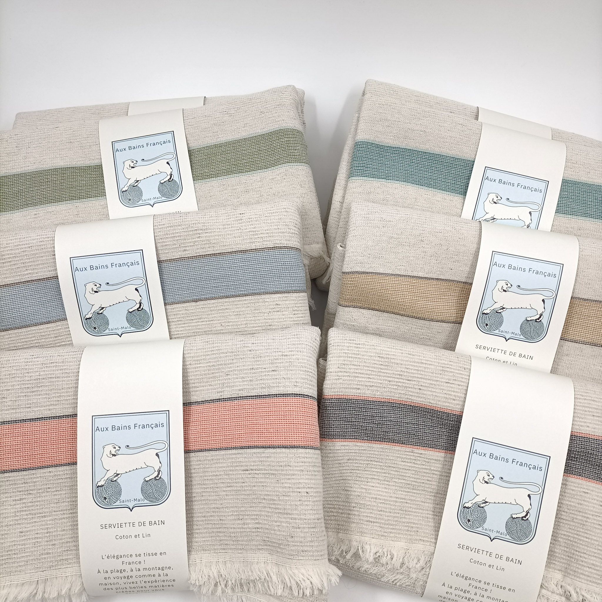 Aux Bains Français est une collection de serviettes de bain françaises. Composées d'un mélange de coton et de lin porté par une armure retrouvée dans une archive textile des années 30. Le résultat tissé est un petit gaufré absorbant, douillet et facile d'entretien. Une finition frangée aux quatre côtés pour conserver le naturel et la souplesse de l'article. Les serviettes ont une dimension idéale pour s'envelopper à la sortie du bain et/ou s'emporter dans un bagage. La gamme de couleurs se décline dans une sélection naturelle basée sur un fond écru au ton végétal naturel barré de deux rayures aux teintes minérales.